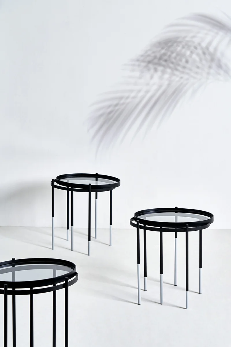 PASSING is an aesthetic expression that materializes the observation on the changes of time, light, and shadow, into a side table. The angle of sun stretches the circle into an ellipse, and, depending on the time it is exposed to light, the side table top extends into two layers of overlapping shadows, whereas the floating legs of various lengths seem to have been frozen in the current of time, visually forming a process of “dynamic movement” to facilitate more dialogues in the overall space.
